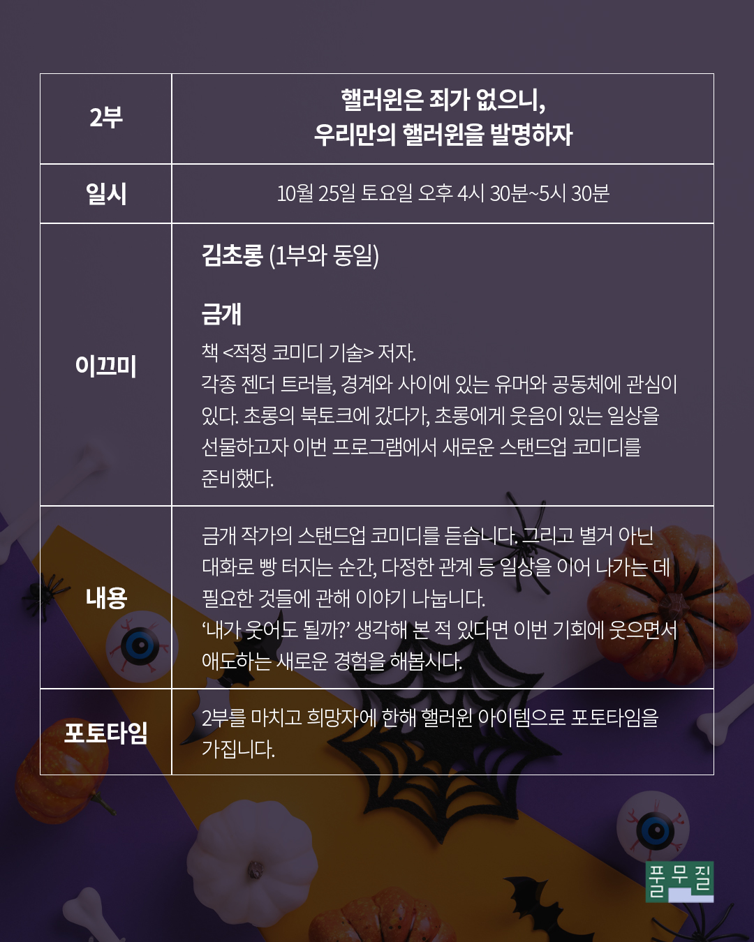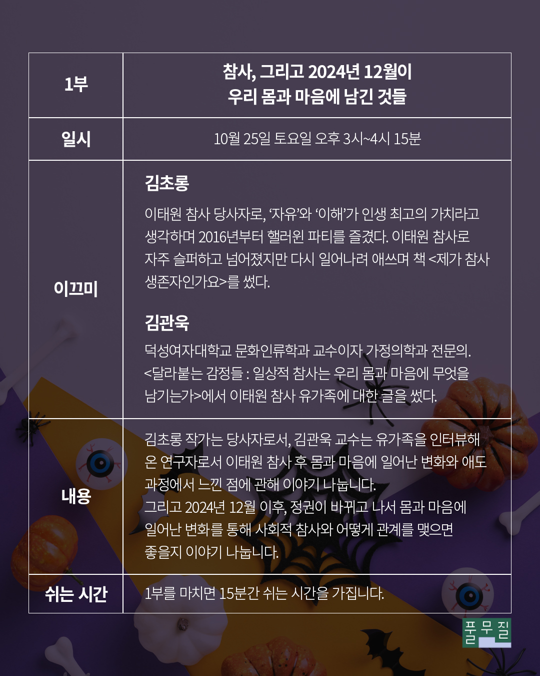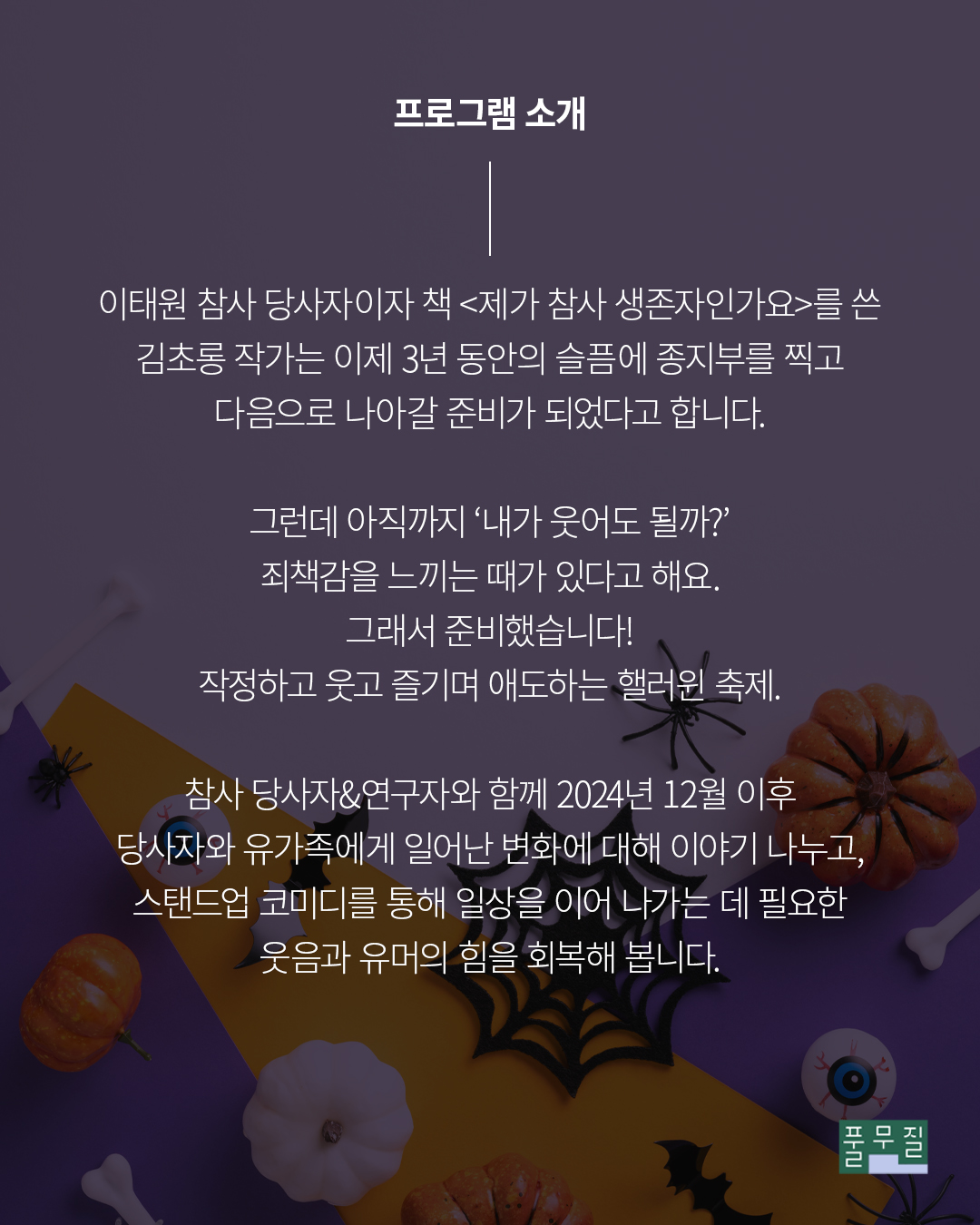 이태원 참사 3주기를 맞아, 참사 당사자와 연구자, 스탠드업 코미디언과 함께 핼러윈을 기념하고 즐기며 애도하는 특별한 북토크입니다. 이벤트를 좋아하지만 죄책감 때문에 즐기지 못하고 있다면, 유머로 애도하고 웃음으로 연대하는 특별한 경험을 함께 해요!
